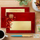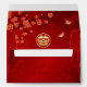 This Chinese wedding envelope features red cherry blossoms and a gold double happiness symbol on a shimmering red background.