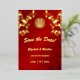 Red cherry blossoms and a real gold foil double happiness symbol on a shimmering red background. Save the date text in an elegant script. Matching Chinese wedding products available.