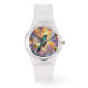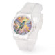I only have one complaint. I ordered the watch with clear case and strap, and what was sent was white case and strap. I'm going to keep it because 1) it looks very nice in white, and 2) it would take too long to get a replacement made and sent in time for my occasion. Aside from the mix up with the color, the watch does look very good in white. The purple dial is actually sparkly which did not show in the online images. That was a nice surprise. If you like Swatch watches this is very similar to those. It's 33.6mm in diameter, 10.5mm thick, and 40.6mm lug to lug. Stainless steel case back says 3ATM/30m WR, so no swimming or showering or submerging this one. If you like Woodstock, this is a great choice.