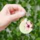 Close up view of the delicate cherry blossom flower. A pastel-pink flower with soft round petals. Background is a pale lime green.