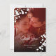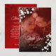 This Chinese wedding thank you card features a custom wedding photo, a gold double happiness symbol and white cherry blossoms on a ruby red background and an elegant classic script. Matching wedding suit available.