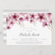 Chic floral baby shower invitation features a top border of blush pink watercolor cherry blossoms. Personalise with your baby shower details in modern hand lettered script and traditional sans serif lettering. Invitations reverse to subtle pale grey and white stripes.