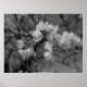 Black and white photo of a sprig of cherry blossoms aglow in the warm spring sunlight in front of a background of branches and sky.