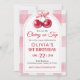 Editable cherry bow birthday invitation. Features a watercolor cherry with a pink bow, and a gingham pink and white background.
