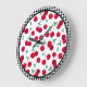 This wall clock is made with a cherry fruit print with a black and white chequered border.