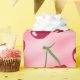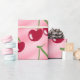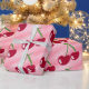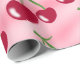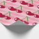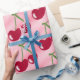 Red cherries with green stems on a soft pink background create a repetitive fabric pattern. The cherries are uniformly shaped and shaded, adding a glossy appearance. The green stems contrast with the vibrant red of the cherries, providing a fresh, lively look. The design is simple yet striking, often used in textiles for a playful and cheerful aesthetic.
