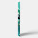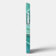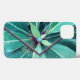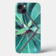 The original artwork by MaeFlowers on this iPhone 13 Case is a design in the style of a clutch bag, with a flap and button closure. It was created from an original photograph of leaves on a newly growing cherry tree. The closeup photo was shot from overhead, showing the whirl of leaves as they grow. The leaves are in varying shades of green, from dark bluish green at the base to a more yellow green in the newest growth. The stems of the leaves have a reddish purple colour. The photo has fabric textures, the aqua trimmed flap like silk, and the lower part of the bag like rougher tapestry. The round aqua blue button closure is trimmed in a gold coloured ring, and there are purple sequins in gold rings trimming the flap of the bag.