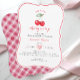 Celebrate your sweet little one on the way with this charming Cherry on Top baby shower invitation. Featuring watercolor red cherries, playful typography, and a pink gingham back, this design blends classic retro style with modern flair. Perfect for a girl’s shower, it sets the tone for a cheerful and fun celebration. Personalise with your party details for a unique touch your guests will love.