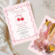 Designed with love and attention to detail, each invitation features a whimsical wavy pattern that adds a playful touch to the overall design. The combination of red cherries and pink bows creates a delightful contrast that captures the essence of fun and sweetness.