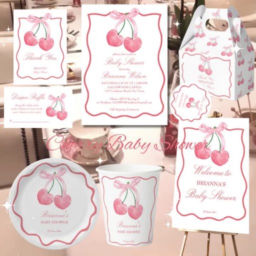 Cherry pink bow coquette whimsical baby girl baby shower invitation editable template instant digital download, cute cherries with a bow ribbon border baby shower invitation cards cherry baby shower invitations summer fruit baby shower invitations