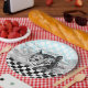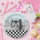 Set of eight 9” paper plates with a vintage image of Alice in Wonderland's mischievous Cheshire Cat on a grey and light blue chequerboard background. See matching candy jar, espresso cup, pitcher, teapot and coasters. See the entire Wonderland Plate collection in the FOOD/BEV | Dishes section.