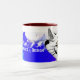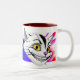 The CheshireFX logo prominently displayed on one side of the mug features a stylised Cheshire Cat with a subtle grin, designed in crystal clear white and black making it stand out against the blues and reds.