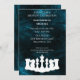 This chess birthday invitation design features a blue nebula design with white chess pieces to include the queen, bishops, knights and rooks.