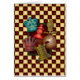 Greeting card featuring chess design with vector art of the King, Queen, Bishop, Knight, Rook and Pawn against a brown and yellow chess board.