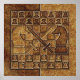 An in-stone look design of a chess board with set up pieces, plus larger opposing knights and crossed swords.