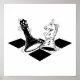 A black and white illustration of a knight taking a queen in a chess game. A black and white illustration for people who loves playing chess, and other board games.