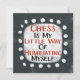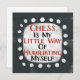 An irreverent typographic design that says "Chess Is My Little Way Of Humiliating Myself". It features black and red text on a white rectangle with funky, playful white dots surrounding it, all on a dark grey background.