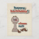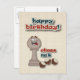 Happy Birthday postcard featuring illustration of a chess pawn, chestnuts and the text "chess nut". The chess pawn has a crazy look on his face with teeth showing and tongue hanging out.