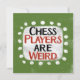 "Chess Players Are Weird" is a cute text design in green with black and red text, along with a white accent shape and white textured whimsical dots surrounding it.