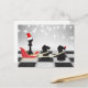 This funny chess Christmas postcard design features Santa's sleigh and reindeer. The Santa Claus is the King chess piece wearing a Santa hat and the reindeer are two Knight chess pieces. They are on a chessboard in front of a winter snow scene with holiday lights. Easily customise the back with a personal Christmas greeting.