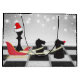 This funny chess Christmas gift bag design features Santa's sleigh and reindeer. The Santa Claus is the King chess piece wearing a Santa hat and the reindeer are two Knight chess pieces. They are on a chessboard in front of a winter snow scene with holiday lights.