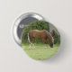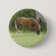 This cute button features a beautiful photograph of a gorgeous chestnut brown coloured horse with a shaggy mane and white feet. The horse is grazing on some short green grass in a field.