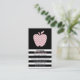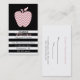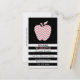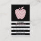 Custom school teacher's business / appointment card, done in solid black, on the top front and a white and black striped pattern, on the front bottom half. Graphics of a dusty rose and white chevron patterned apple decorates the top front of the card, and the back is done in a solid white. Text on the front and back is ready to personalise to read what you want.