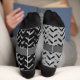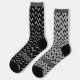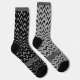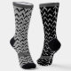 Geometric design featuring a black pattern on a grey sock. And gray pattern on a black sock. Crazy mismatched socks. Space for your name or text around the foot.