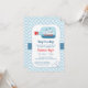 A nautical themed baby shower invitation perfect for mummy to be who is expecting a baby boy! It features a ship sailing in a bottle. A background of blue and white chevron zigzag pattern. Colour palette of red, blue and white. Personalise easily with party details.