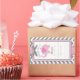 Grey and white chevron print with pink accents and 3D-look polka-dot bow with pink elephant and bird book plate label design.