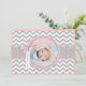 Chic grey and white chevron print with pink accents and 3D-look polka dot bow and ribbon birth announcement photo card.