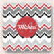 This chevron design in tones of red, grey and black has a red circle with white stitch pattern. Customise with your name and initial. A contemporary design that will brighten up any person's day.