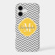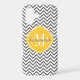 © 2012 Socialite Designs. Our elegant chevron design in grey and white iPhone case has a light yellow banner for your monogram, initials or name.