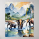 This art print features a watercolor portrait of elephants playing in a river in Chiang Mai Thailand.