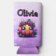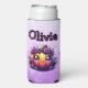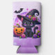 An adorable personalised Halloween can cooler that features a cute black cat in a witch's hat with a pumpkin. bat and cute purple and orange elements. Lots of black, purple and orange elements. Just add a name in the personalise area!