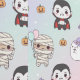 A cute and whimsical wallpaper featuring a charming pattern of adorable, cartoonish Halloween monsters like ghosts, mummies, and vampires against a soft pastel background.