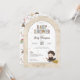 Celebrate your little wizard on the way with this enchanting Harry Potter baby shower invitation featuring Harry himself. This charming design includes an adorable illustration of Harry Potter in his Hogwarts robes, holding his wand and ready for magical adventures. The background is sprinkled with colourful stars for a touch of whimsy. Elegant and playful fonts beautifully display your custom details, including the honoree’s name, date, time, location, RSVP information, and gift registry. The unique arched shape of the invitation creates a storybook feel, while the back showcases a fun pattern of wizarding world icons such as spellbooks, potions, cauldrons, and magical creatures. Perfect for any Harry Potter fan, this invitation brings a spellbinding touch to your baby shower.