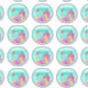 Two tiny mermaids swim in a fishbowl with purple sandcastle.