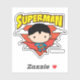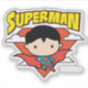 Check out Chibi Superman flying in the clouds with his super hero name overhead and red polka dot shield shape behind him.