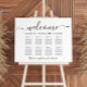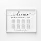 Chic wedding seating chart poster for up to 8 tables that features "welcome" in an elegant script with swashes, your names and wedding date joined together by a heart and "We're so glad you're here" in classic serif typography. Select the digital download option to edit with last minute changes and print locally.