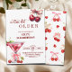 An elegant modern design featuring a watercolor illustration of a cherry martini tied with a pink bow and a cute cherry pattern on the back. Customize the details for a unique and chic Birthday Celebration.