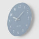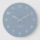This elegant, modern clock features white numerals on a trendy, dusty blue background with a spot to add your name.