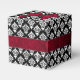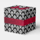 Elegant wedding favour box done in a black and white damask pattern, with graphics of a ruby red satin looking bow, on the top, and ribbon, around the middle of the box. Lovely little gift box for candies and anything else you want to give your guests.