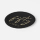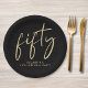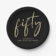 Elegant 50th birthday party black paper plates featuring "fifty" showcased in a modern chic gold script.