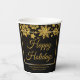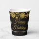 Chic corporate Christmas party paper cup with Happy Holidays written in elegant gold cursive script under a beautiful border of snowflakes falling on modern black holiday decor. Customise these professional holiday cups with your company or business name.