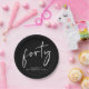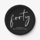 Elevate your 40th birthday party decor with these chic black paper plates featuring "forty" showcased in a modern white script.