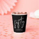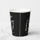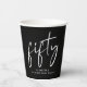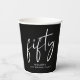 Fun 50th birthday party decor black paper cups that feature "fifty" showcased in a chic modern white script.