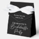 This elegant black bachelorette party favour box features chic white typography for a modern bride who is going to have an upscale event with her bridesmaids. Trendy personalised minimalist bridesmaid gift boxes.