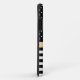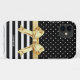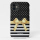 Stylish iPhone case, with a black and white polka dot pattern, on the top of the case and a black and white striped background, on the bottom. Graphics of a pretty gold tone ribbon and bow runs across the case between the two backgrounds. White custom text, on the bottom half, is ready to personalise. Pretty way to protect your device and look stylish too, and makes a great personalised gift idea.