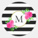 Chic Black White Striped Pink Floral Monogram Classic Round Sticker